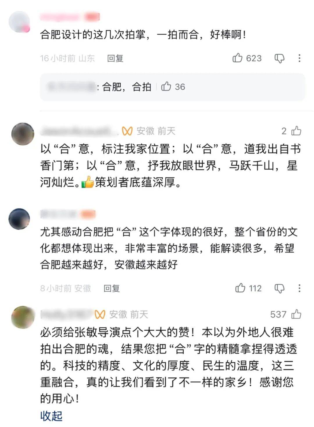 第一次“掌心相合”,是演员与徽派木雕和合童子的“大手拍小手”,是民俗与传统文化的融合。“合”字烟花透着浓浓的年味,“合”字花馍满是团圆的味道,舞蹈光影里也飘出“合”字,观众自然而然就感受到了合肥“因合而聚、因合而兴”的城市气质。